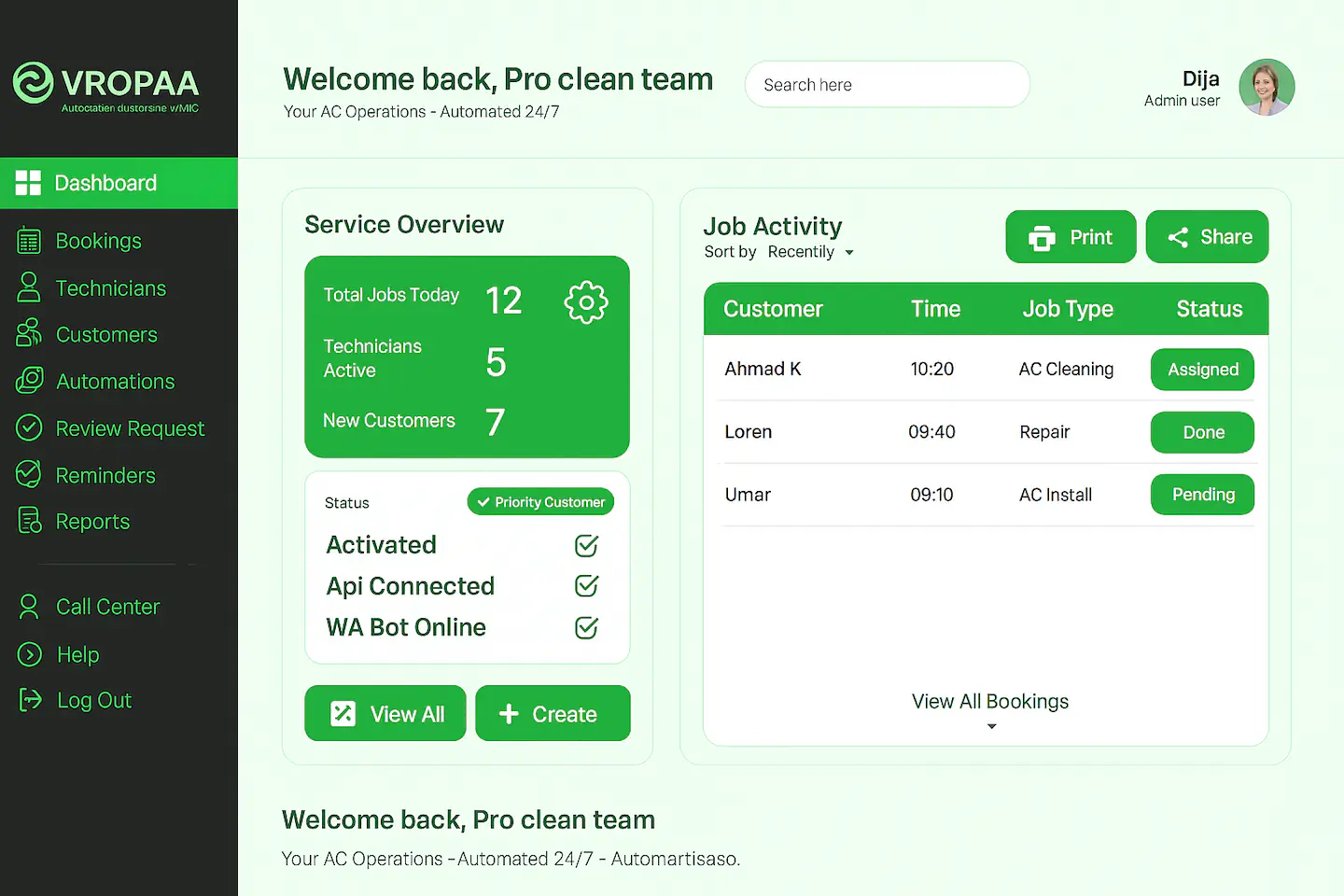 VROPAA uses real backend architecture — dedicated servers, professional APIs, and structured databases tailored specifically for AC service operations. THIS IS NOT A NO-CODE SETUP — but a fully engineered automation platform that delivers speed, stability, and scalability